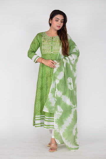 Step out in this beautifully crafted ethnic kurta pant dupatta set, adorned with bandhani print...