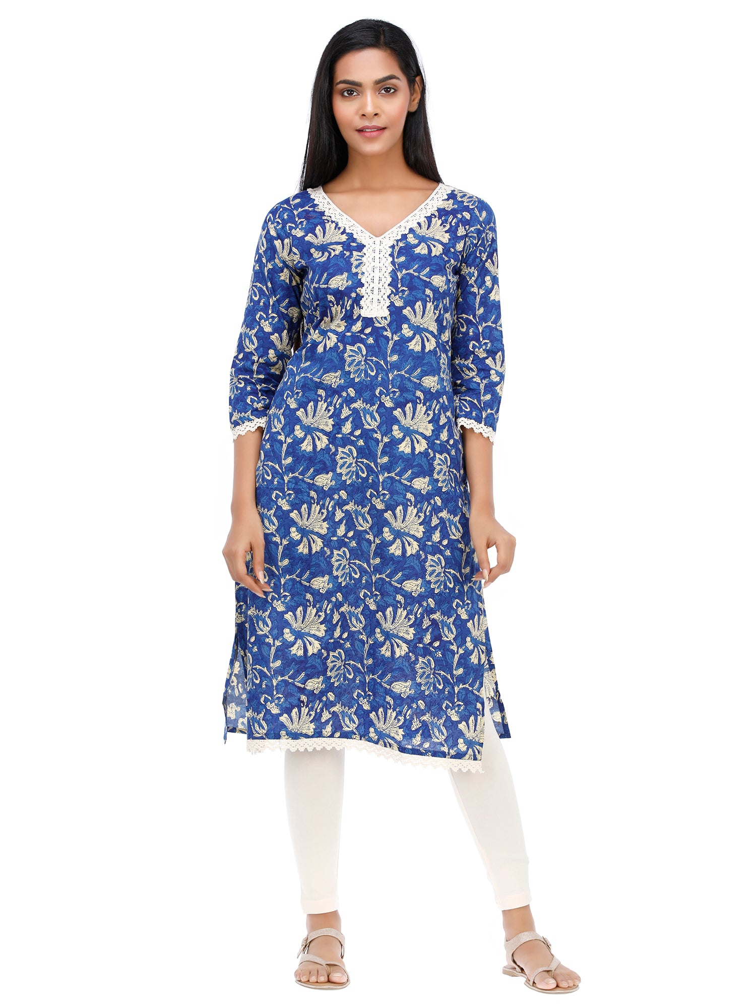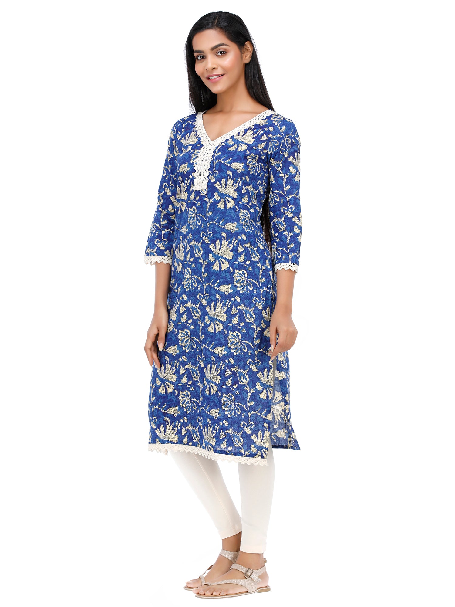 Floral Printed Woven Cambric Lace Border Indigo Kurta