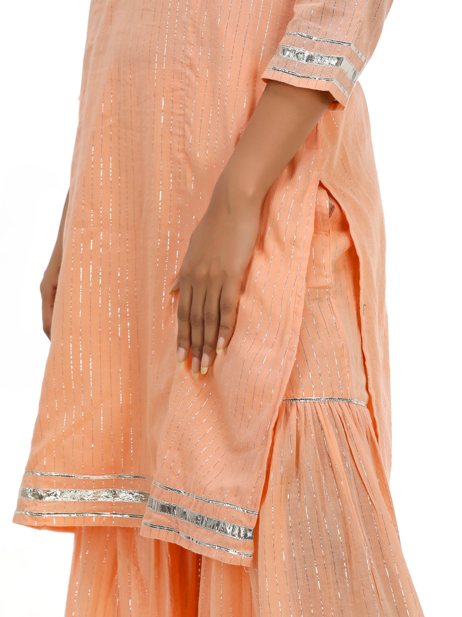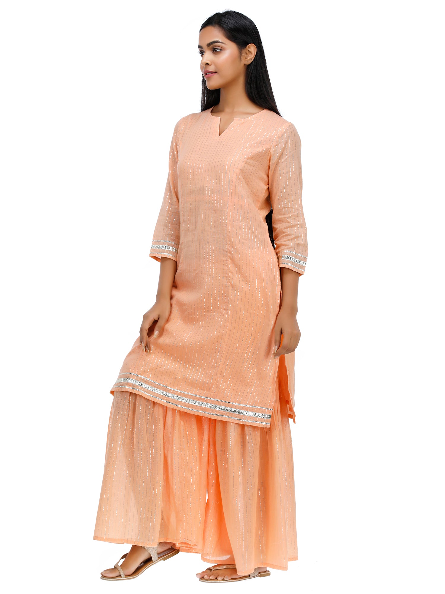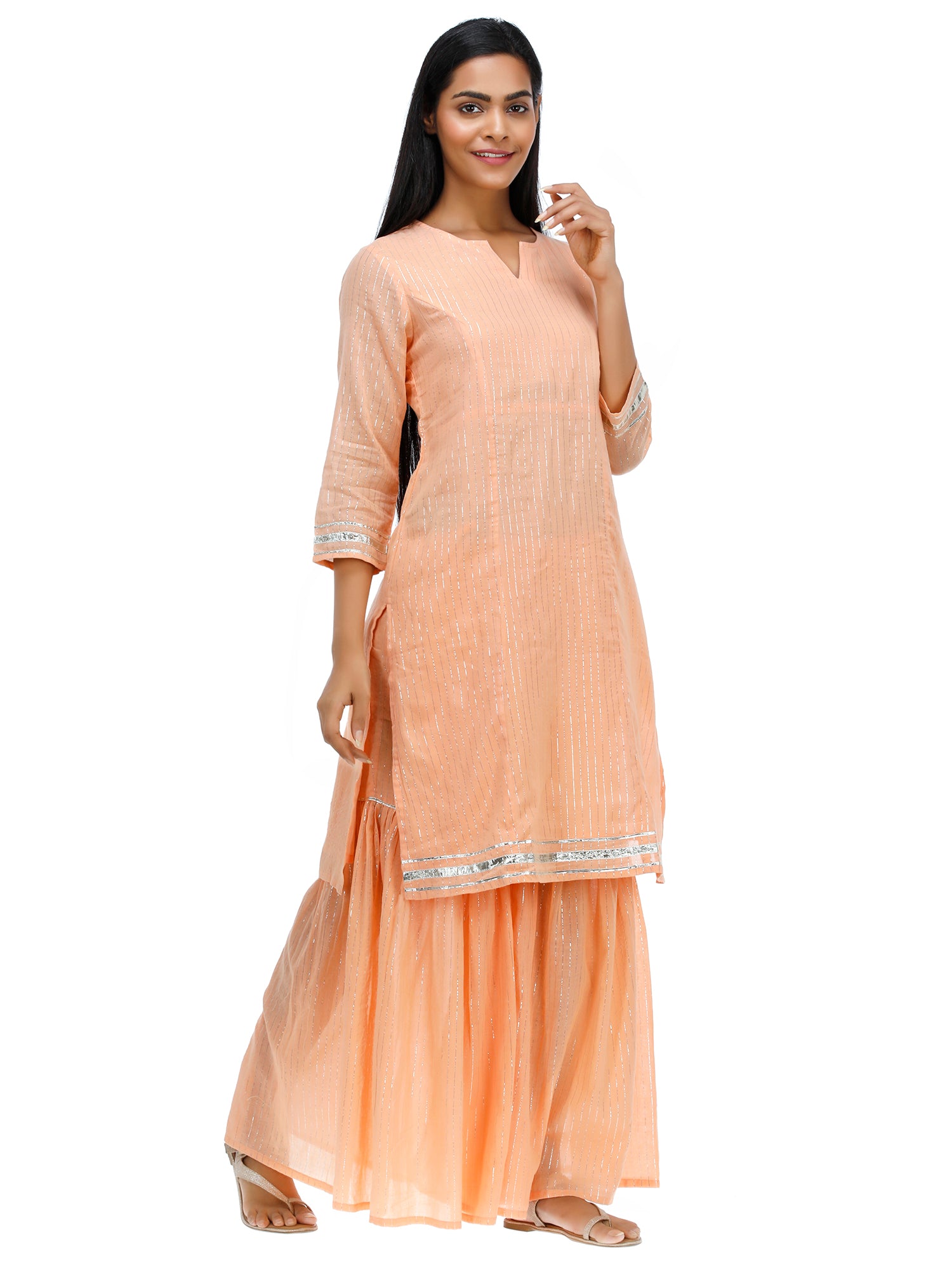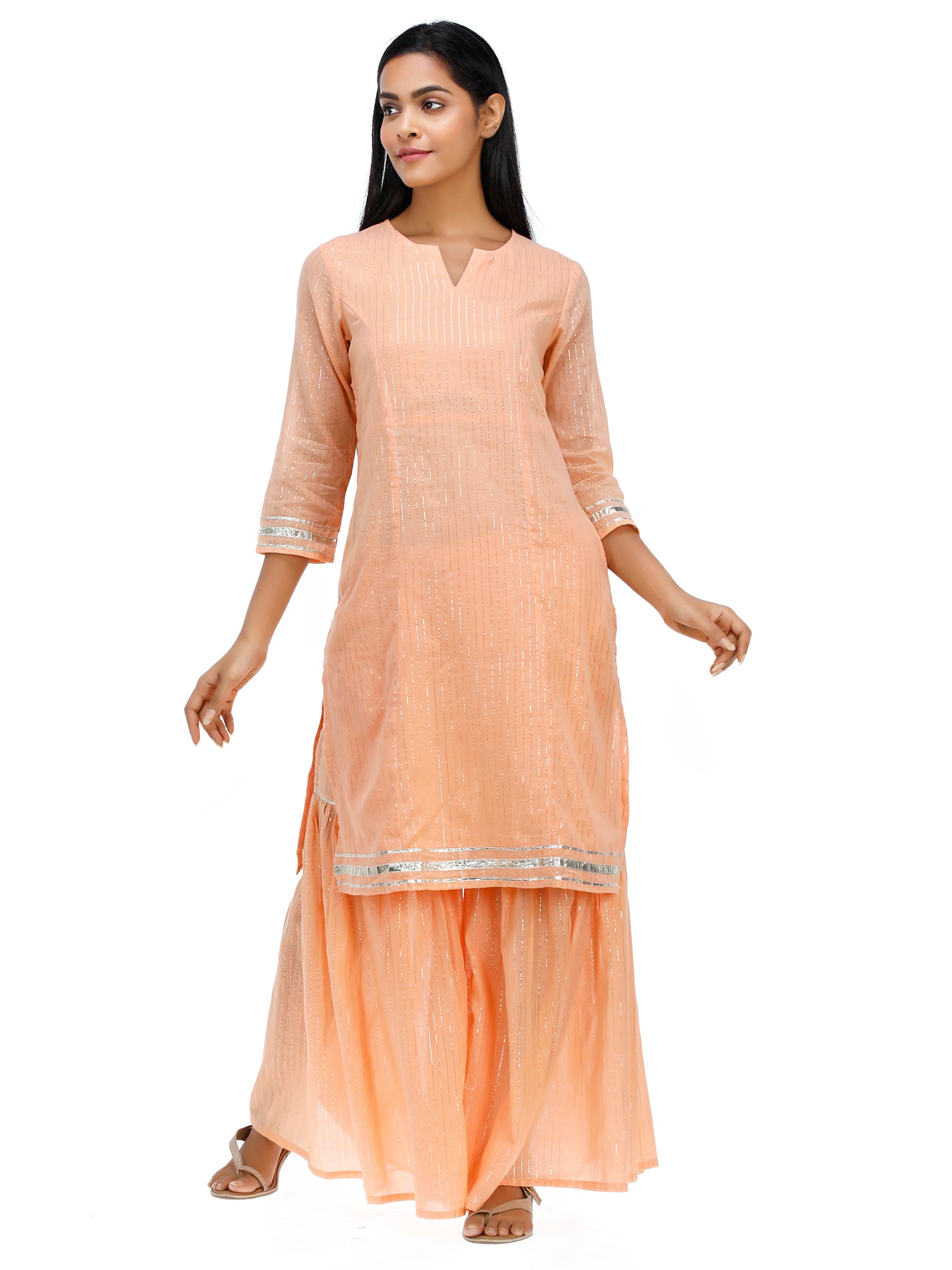Women Woven Cotton Voile Lurex Peach Kurta Sharara Set