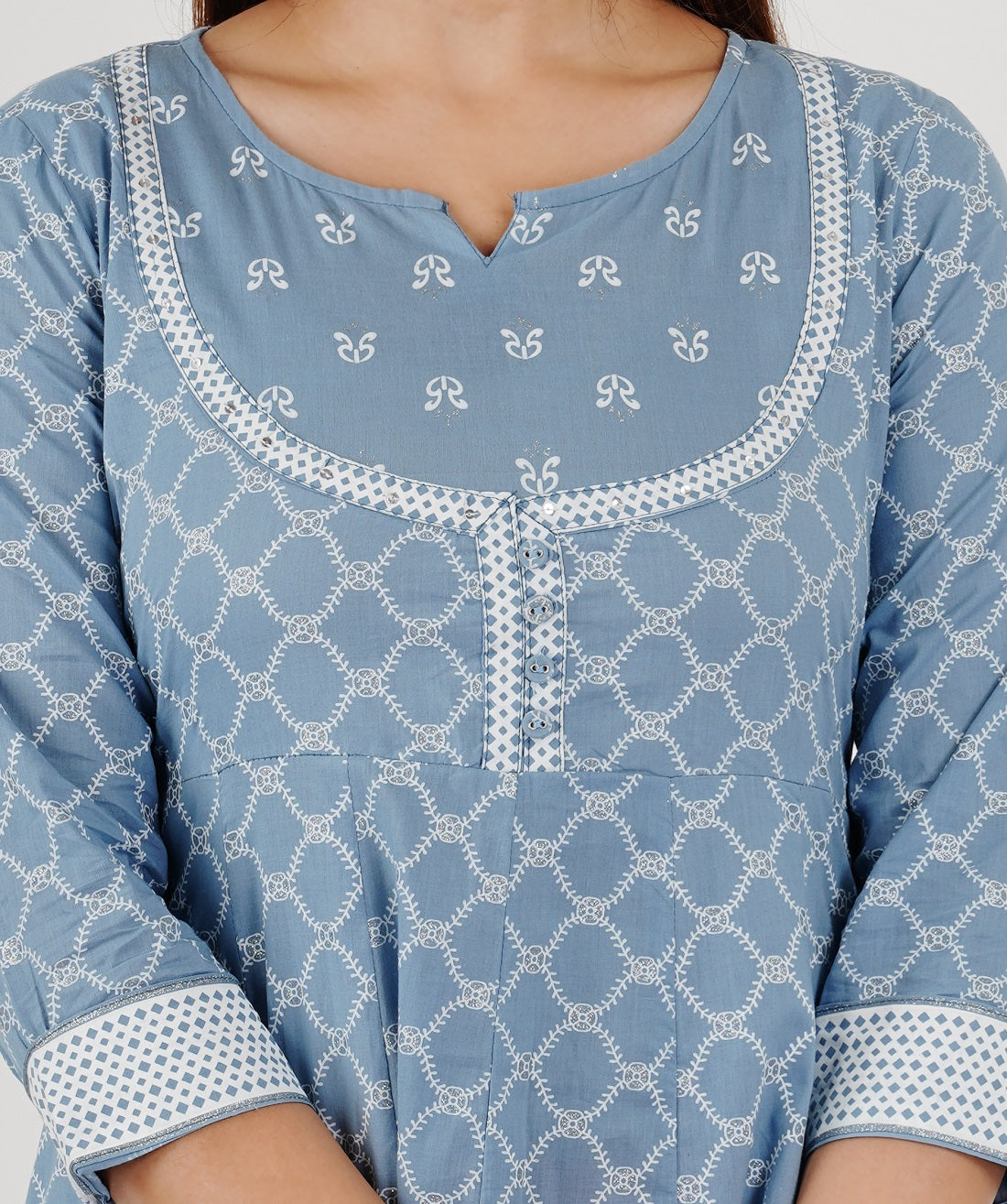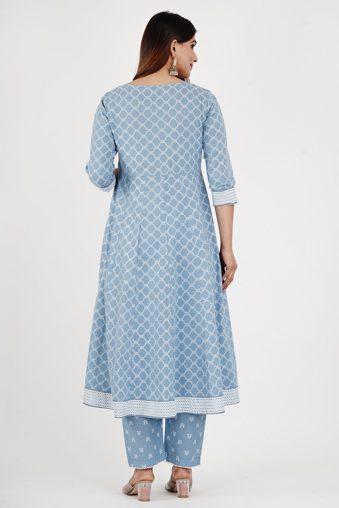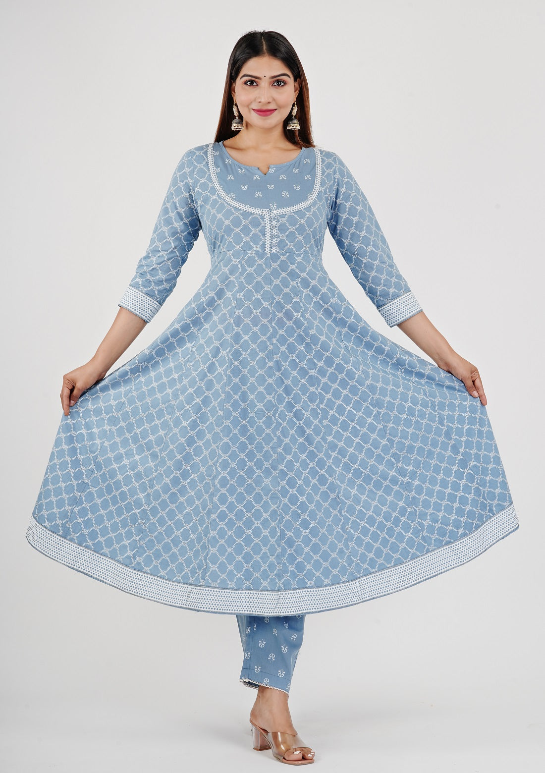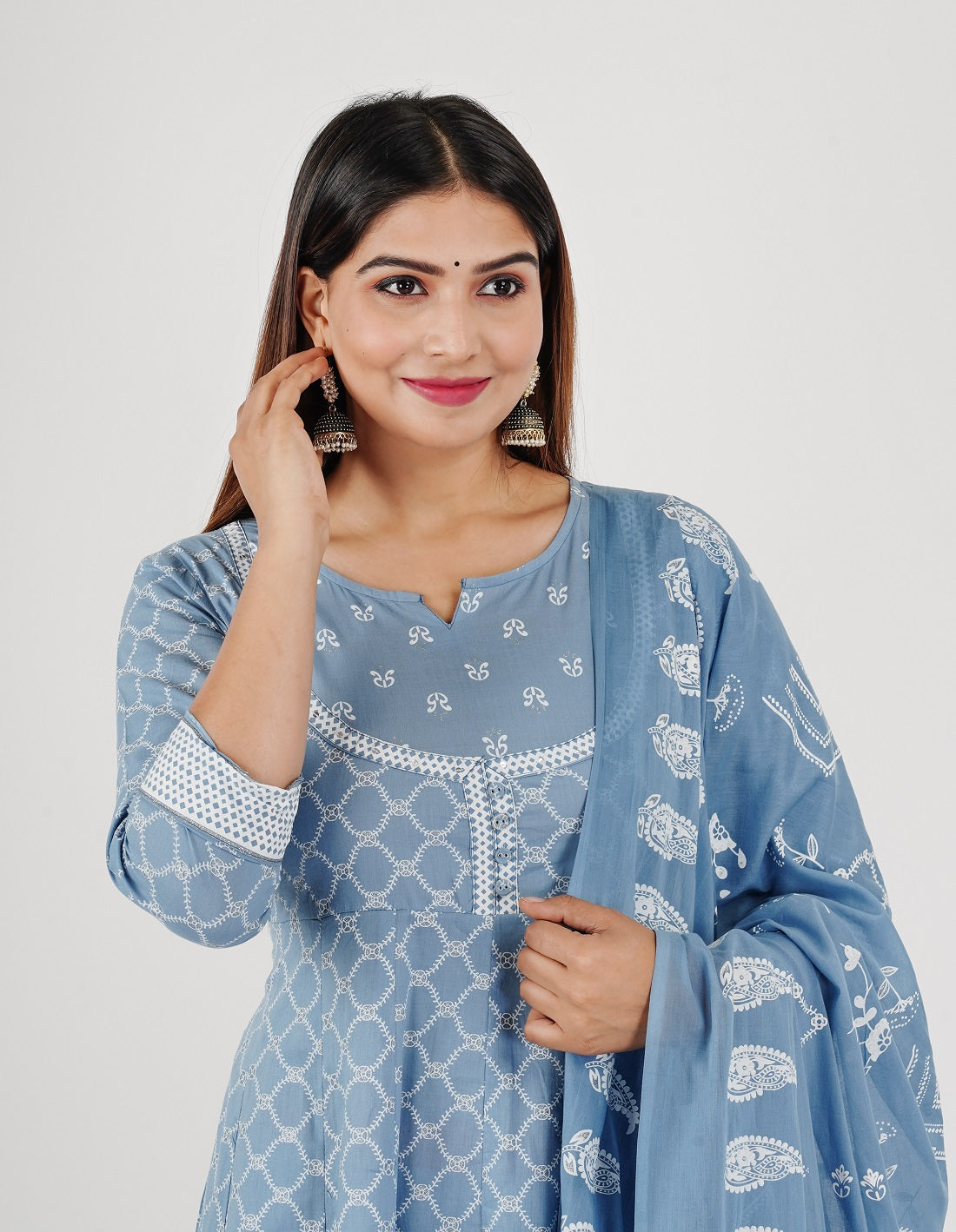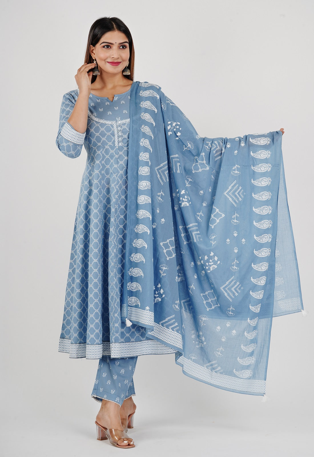 Women's Cotton Printed Sky Blue Anarkali Kurta Pant with Dupatta